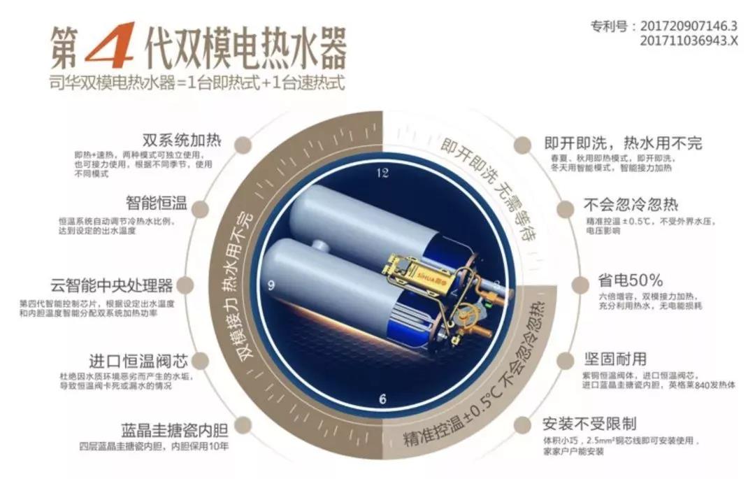 专业人士表示:“双模技术虽然听起来简单,但是要真正做到体验优秀、稳定耐用并不容易。它结合了即热和速热的优势,但也继承了它们的不足。”司华双模热水器在技术上追求精益求精,追求完美。据了解,司华在2017年成功申请了双模技术专利,在2018年又成功申请了双模双恒温专利。当前市场上非双模恒温速热热水器,恒温的误差值一般控制在±3℃,司华双模热水器采用双恒温技术,将恒温的精准度控制在±0.5℃。李军自信地表示:“双模接力系统不是即热和速热的简单相加,而是依靠传感器实时监控、智能芯片实时计算、高精度恒温阀即时调节的协同配合结果,才能达成优秀体验。”